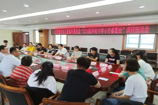 2019年8月28日下午,江蘇榮浩投資集團(tuán)有限公司監(jiān)事會主席、江蘇省婦兒基金會榮譽(yù)理事長王小方女士、盱眙縣人大副主任、盱眙中學(xué)校長葛天成、江蘇省婦兒基金會辦公室主管李成忠、盱眙縣婦聯(lián)副主席張艷及盱眙中學(xué)2016級“小方春蕾班”全體學(xué)生參加“2019級盱眙中學(xué)小方春蕾班”調(diào)研座談會。